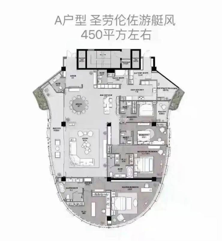 户型面积 约430-450㎡大平层,4房+1房2厅6卫配置12