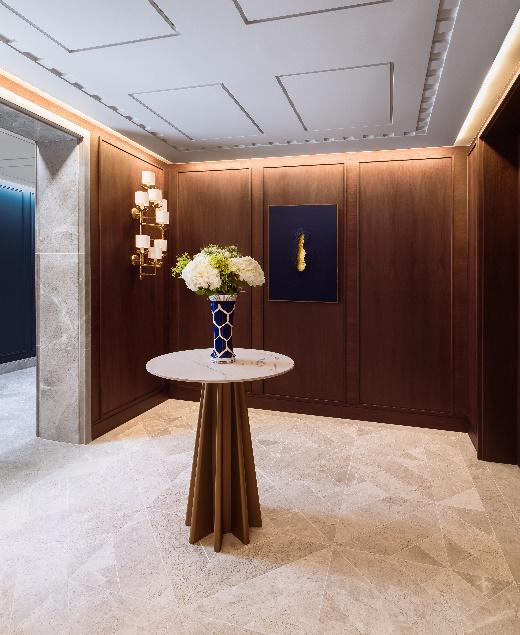 踏入门廊,映入眼帘的是爱马仕蓝色花瓶,与庄重的木门相映成趣。穿越回廊,住户能饱览臻选自Cadogan画廊的艺术珍品,让灵魂与艺术共鸣。