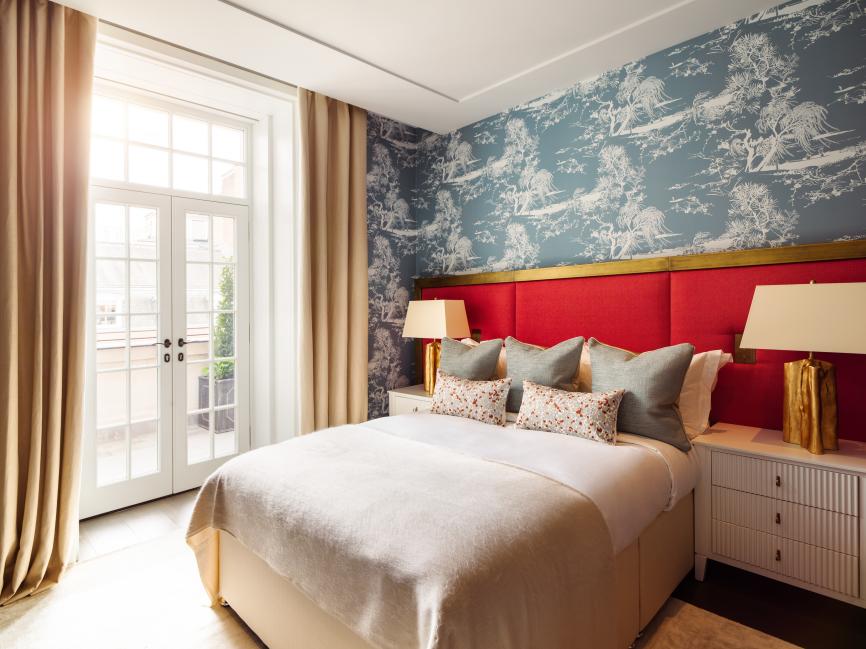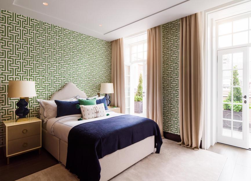 除了少有的家具与装饰,亚洲风格也在此得到巧妙运用,东方元素点缀其中。古典庭院灵感跃然卧室壁纸之上,宫殿般的花园迷宫现于眼前,黛绿与乌木的组合致敬中国古老象形文字,营造出工整对称的东方美感。卧室设计的独特之处,在于极具东方韵味的壁纸装潢,更在于直达户外花园的露台,因此也被称为“花园卧室Garden Bedroom”。在这里,住户可私享梅菲尔珍稀户外空间,虽置身室内却可拥自然入眠,开启自然健康生活。