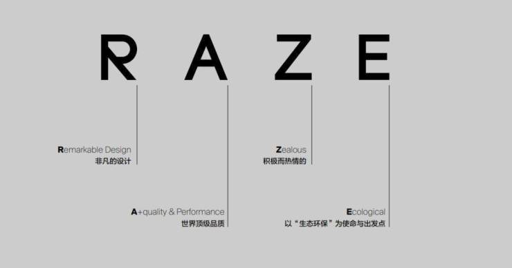 RAZE劳绅品牌LOGO采用无衬线字型设计,整体视觉简洁大气,在信息繁杂的环境中更易识别。稳定的字型布局,极具国际品牌视感。