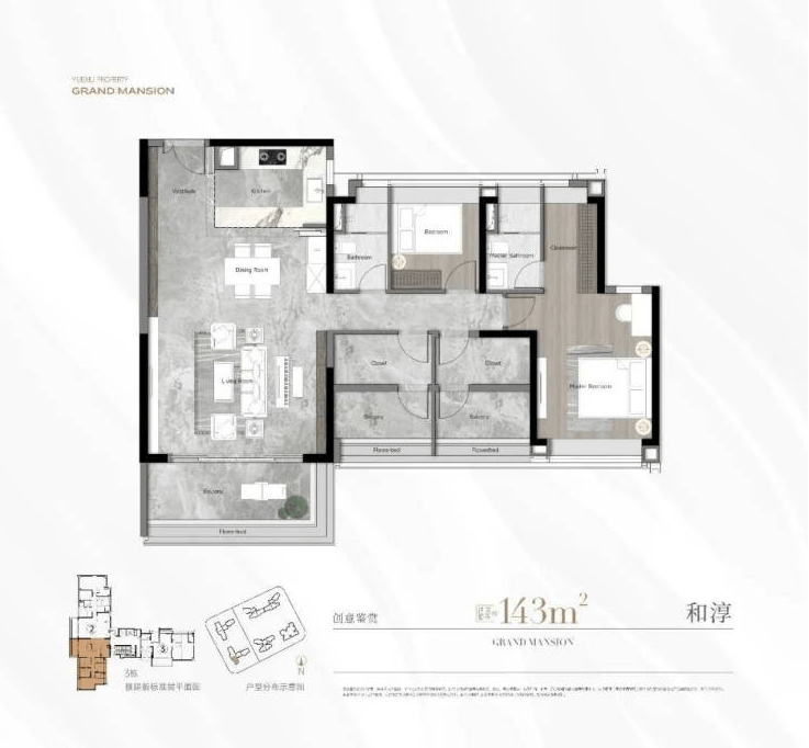 143㎡四房两厅两卫,总价849万起,2梯3户布局,南向望江,四开间朝南,南北双阳台设计