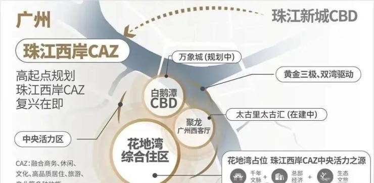 此外花地湾片区基本都是由万科统一开发,汇合白鹅潭-花地湾-聚龙组团的板块张力,白鹅潭核心区、聚龙组团、花地湾组团,于半径约2KM内构建珠江西岸CAZ黄金三极。