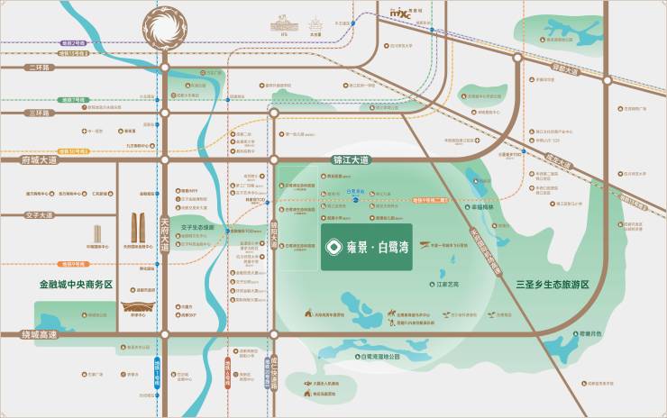 项目位于成都市锦江区白鹭湾板块,东临三圣乡4A风景区,西接白鹭湾科技生态园、交子公园金融商务区,林家坝TOD片区,南临白鹭湾湿地公园。