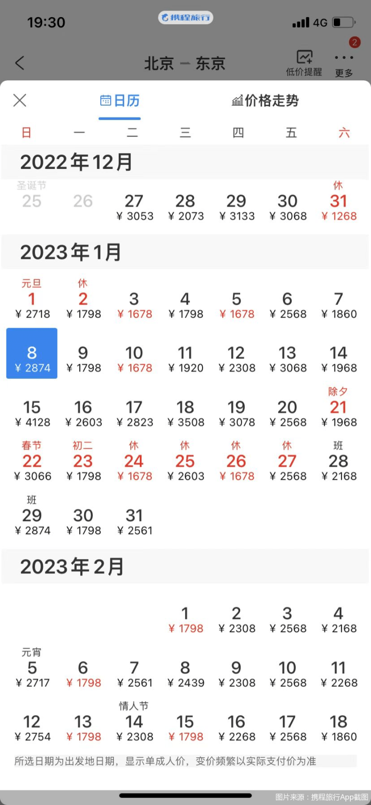 价格方面,机票平均价格环比下跌12.9%。热门出境目的地包括新加坡、韩国、中国香港、日本等。北京商报记者查询携程旅行App发现,北京-新加坡航线明年1月最低价为1358元,较今年12月最低价下降了400元。