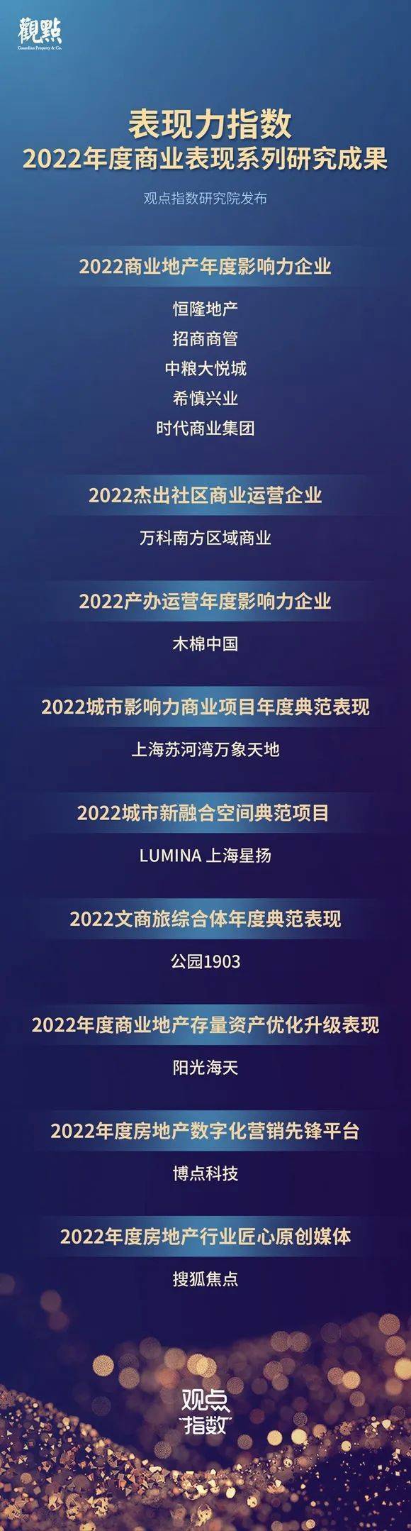 与此同时,观点指数继续寻找年度引领行业高质发展的主体,树立商业发展新格局。相关研究成果汇聚成“表现力指数·2022年度商业地产表现”,并在2022观点商业年会现场隆重揭晓。