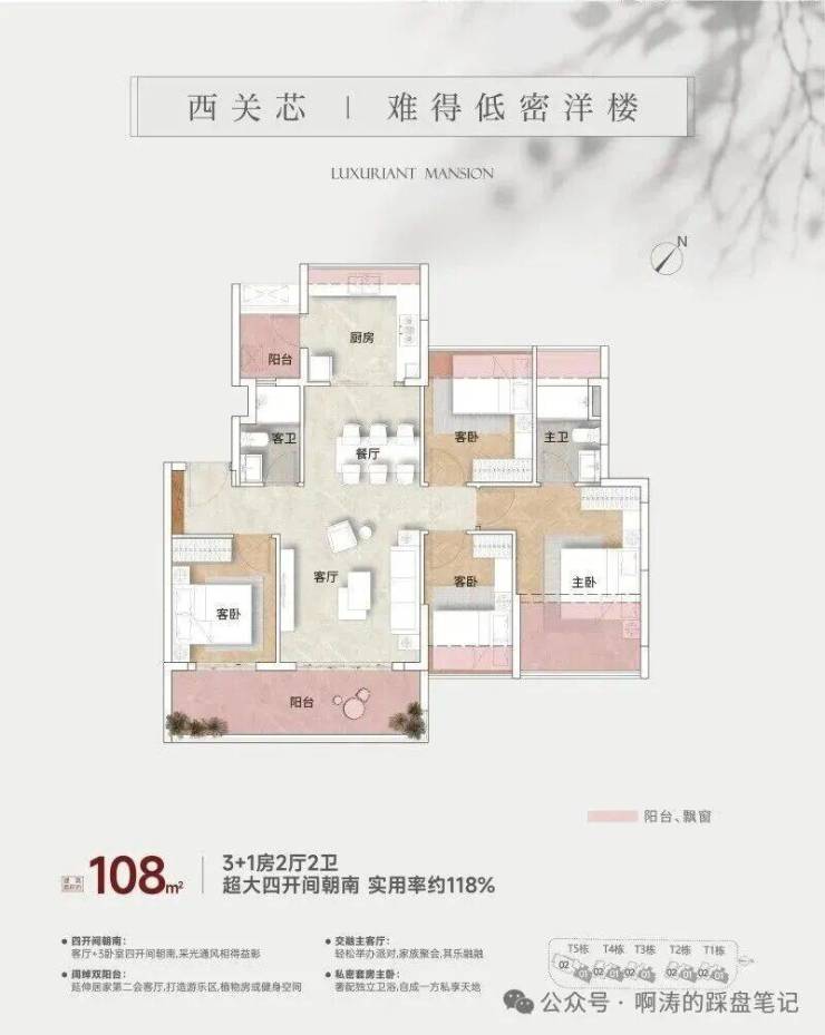整个项目有5栋10层南向板楼,三个户型分别是98平、108平和156平,全四房设计。