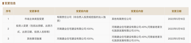 在工商信息变更前,河南建业华谊兄弟文化旅游产业有限公司由济源建业住宅有限公司、河南建航房地产开发有限公司及建业住宅集团(中国)有限公司分别持股51%、39%及10%;工商信息变更后,河南建业华谊兄弟文化旅游产业有限公司由河南老家文化旅游发展有限公司持股90%,建业住宅集团(中国)有限公司持股10%。另外,河南·戏剧幻城项目的运营主体河南建业实景演出文化发展有限公司于同日发生股东变更。工商信息显示,河南建业实景演出文化发展有限公司原由河南建业住宅建设有限公司100%持有,股权变更后,由河南建业住宅建设有限公司持股49%,河南老家文化旅游发展有限公司持股51%。