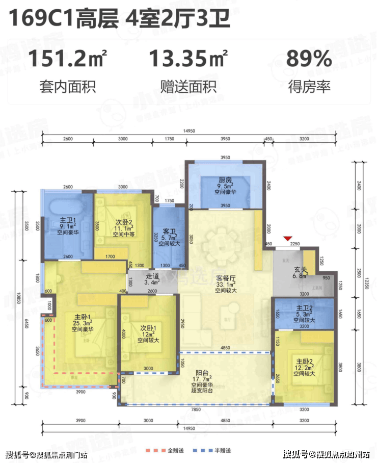 建面约169㎡C1-C2四室两厅三卫户型: