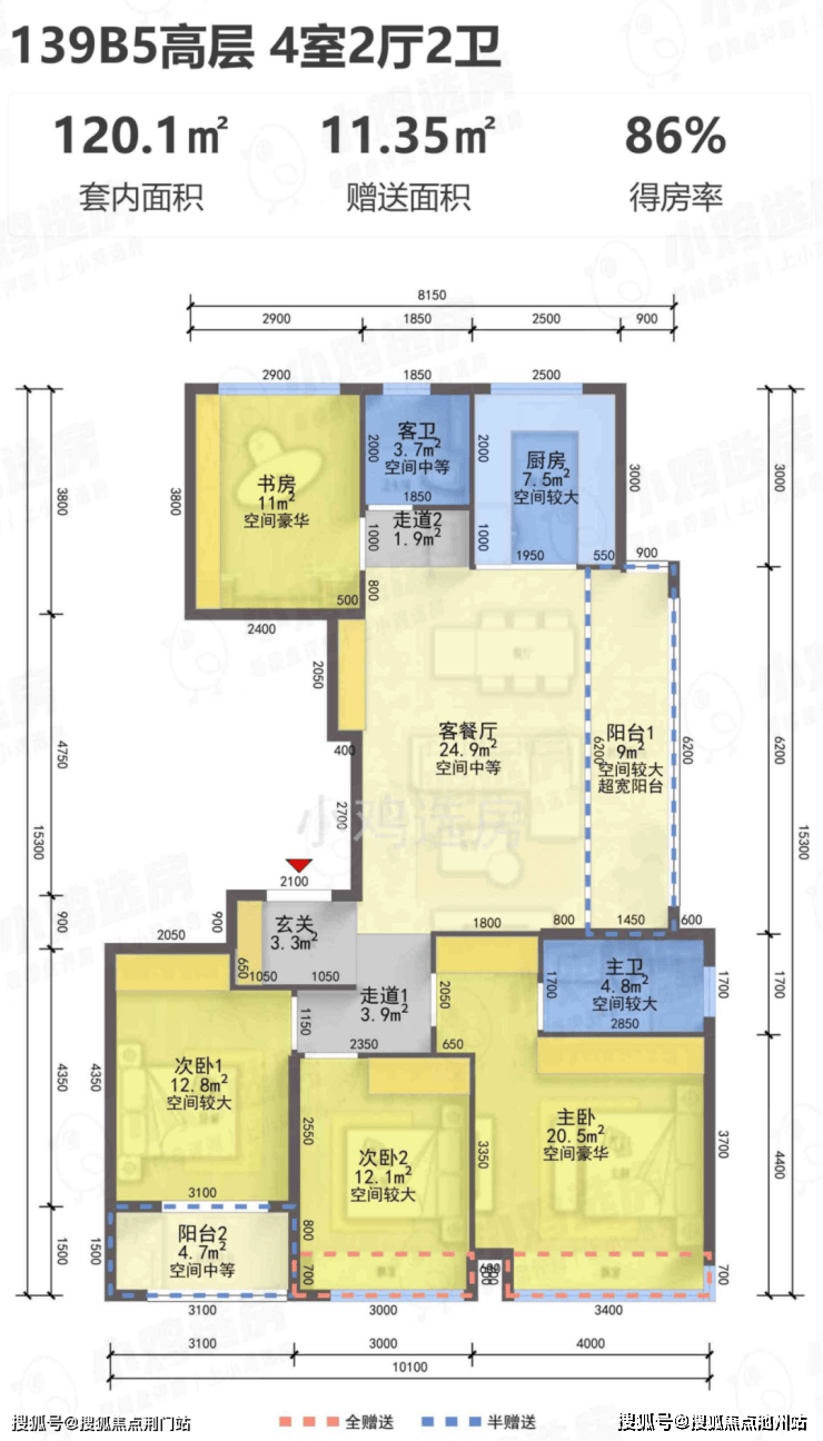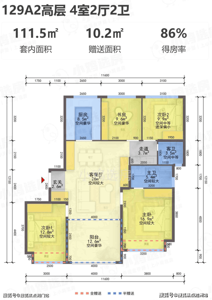 建面约129㎡A1-A2四室两厅两卫户型: