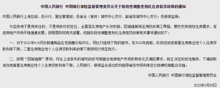 9月29日晚,央行、银保监会发布通知,符合条件的城市,可自主决定在2022年底前阶段性维持、下调或取消新发放首套住房贷款利率下限。