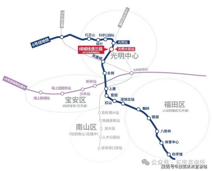不过在当下,光明最重要的是通勤。桂语兰庭邻近6号线光明大街站,周边还有6号线支线(在建)、13号线(在建)、18号线(规划中),三线接驳圈领光明交通主场。
