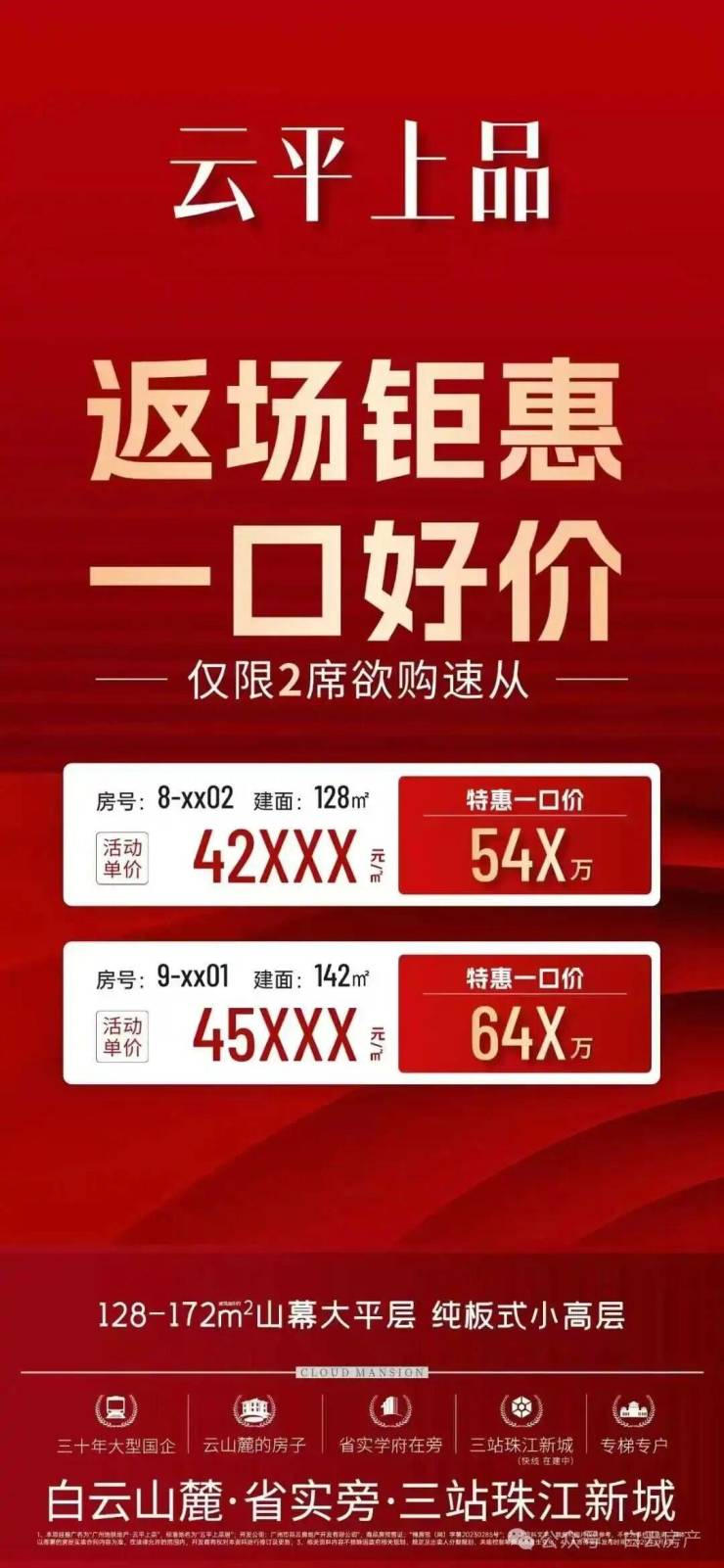 云山麓的房子【广州地铁地产云平上品】面积128-172㎡头排山幕·纯板式大平层、今年买今年住、专梯入户+板式小高层