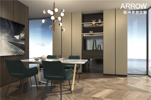 2.7米高的餐边柜,高、储物空间大,加上结合黑玻的映射下的铝合金玻璃层板灯,优雅的气息就扑面而来。箭牌家居定制劳斯系列餐边柜岛台面处采用了质感优质的石英石材料,触手之处,细腻滑溜,烘托了主人清晰脱俗的时尚品味。在桌面点上一根蜡烛,从餐边柜拿上一瓶红酒,浪漫的烛光晚餐定能虏获爱人的心。