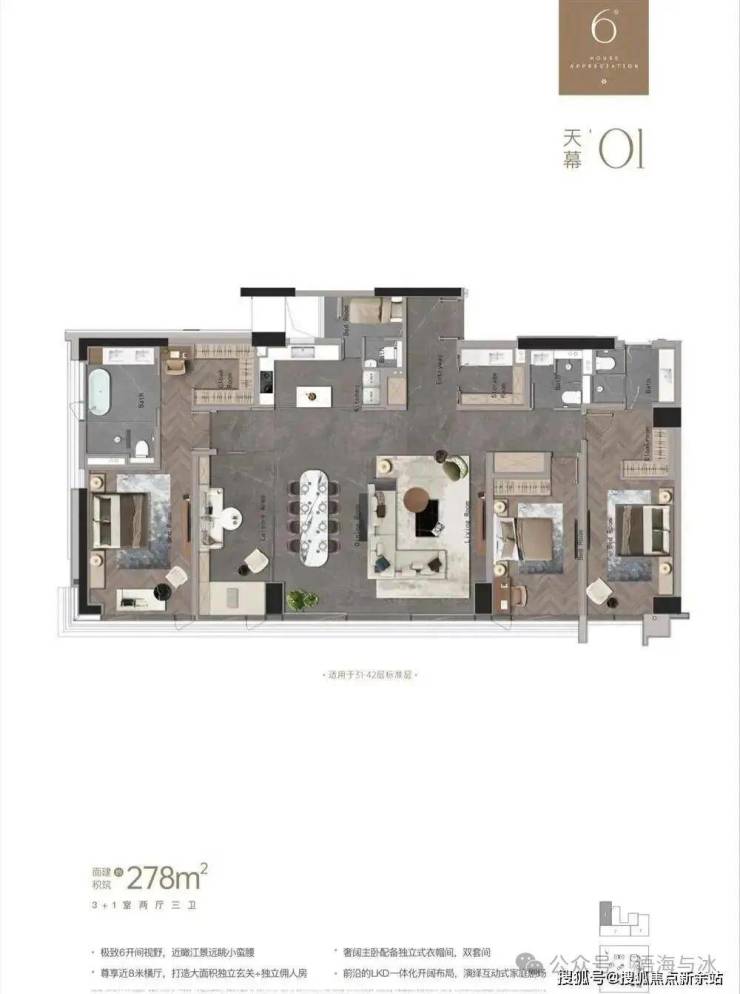 产品方面,项目提供多样化高端住宅配置,满足不同层级的生活需求。叠墅产品位于7栋与10栋,面积区间240-310㎡,为城市中轴线上罕有的南向首排一线江景叠墅,空间层次丰富,居住私密性强;大平层分布于6栋高区至低区,面积段覆盖79-400㎡,其中高区单位具备270°观景视野,尽揽珠江壮阔与小蛮腰天际;中低区单位则打造实用型江景住宅,面宽设计极致优化,5开间朝南,13米以上阳台面宽,营造超阔观江视界。loft公寓位于5栋,面积段为41-110㎡,买一层送一层,精装交付,是市场稀缺的投资型优质产品。另配备写字楼产品,单层面积达1060㎡,整体约4万㎡,匹配城市总部级办公需求,成就金融城商务新地标。