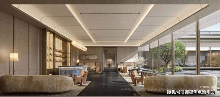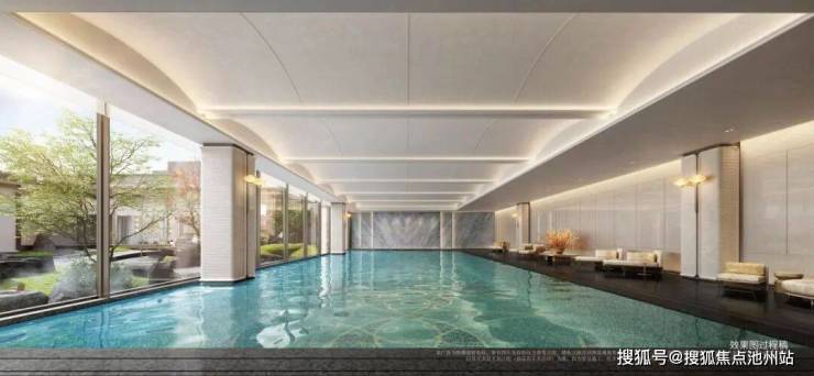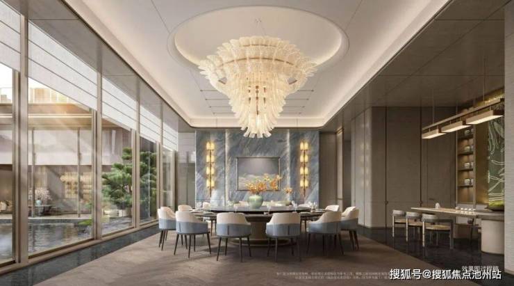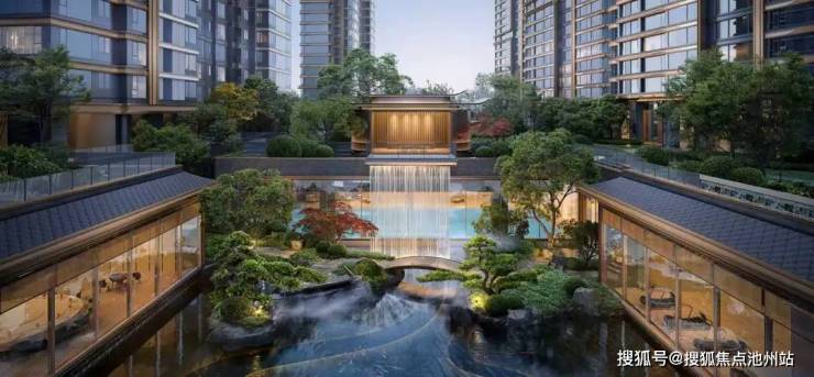 还有下沉式飞瀑庭院设计:围绕着飞瀑景观,规划了下沉式会所,有恒温泳池、私宴厅、健身房、行政酒廊等;架空层泛会所有品茗区、儿童空间等。