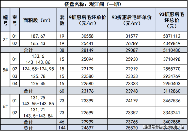 6#143方东边间错跃有一定东北侧、东南侧江景视线,2.34万元/㎡;其余普通143方和125方,9折折后均价约为2.2万多元/㎡。