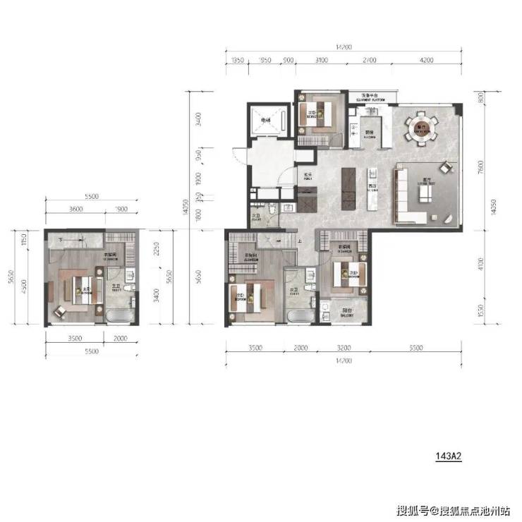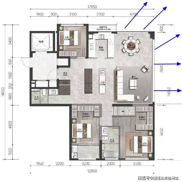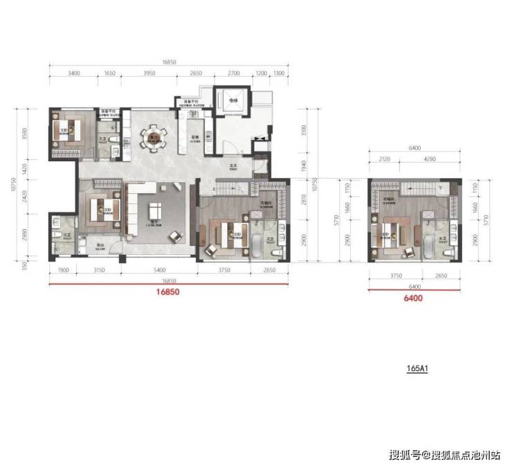 ---建面约165方四房四卫,做了三套房全明格局,市面上罕见。可以视自身需求,改成三房三卫,将南向一房纳入客厅,做成横厅,尺度感和排面感更足,可以排布中西厨、岛台、大圆桌,或者开放式书房等等: