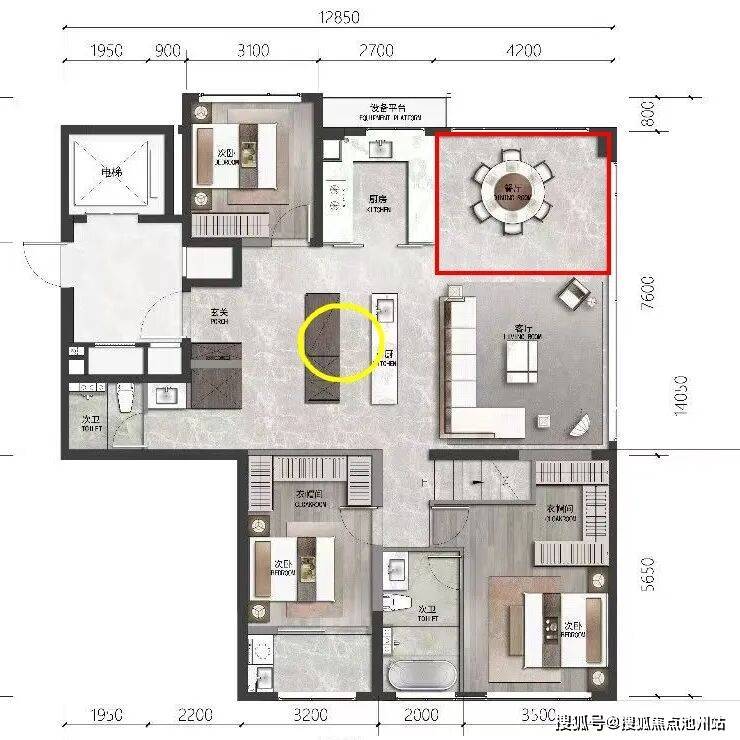 ---除了如户型图这样的摆法外,还可以将餐厅挪移到黄圈处,将红框处调整为多功能空间,西厨岛台也好,书房钢琴室也可,空间利用率更高;