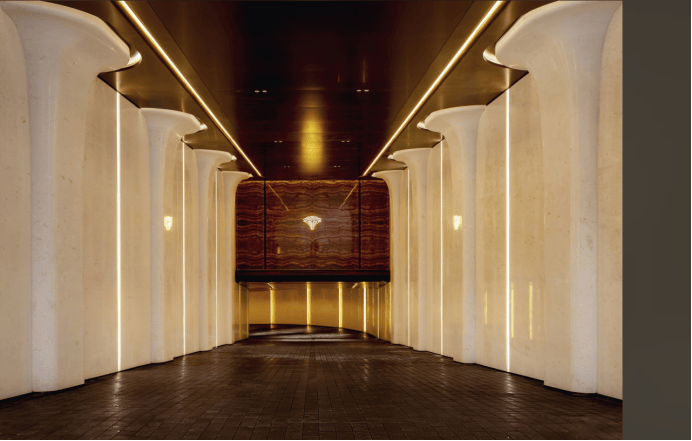 门庭延街的外立面,以精工定制弧形 米色石材 为主调,镶嵌典藏级 老虎玉大理石 ,点缀 古铜色现代海派艺术感灯器 ,整体呈现出百年海派的贵雅气质。
