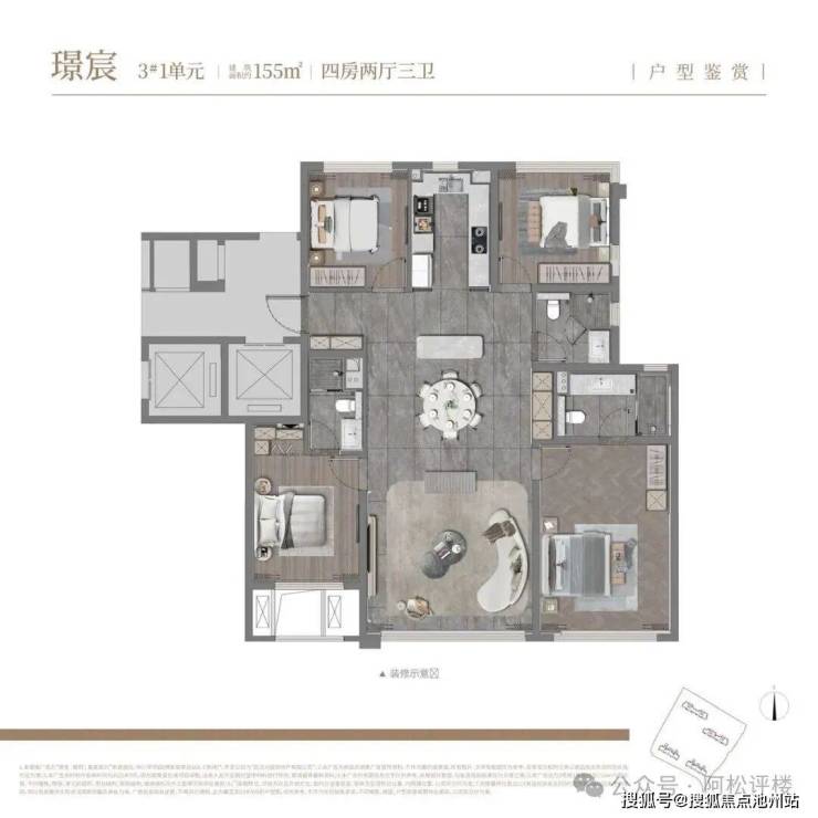 该户型带独立电梯前室,两个卧室能做到270° 景观视野,大概率也是双面飘窗。不过,南向次卧卫生间是暗房,南向次卧外有空调机位,按照户型图显示会一定程度遮挡采光(实际情况待定),餐厅位于户型中部,采光较弱。