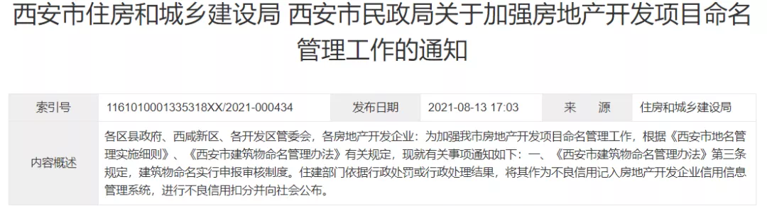 8月13日,西安市住建局和民政局联合下发通知,加强房地产开发项目命名管理,部分楼盘将面临“更名”。