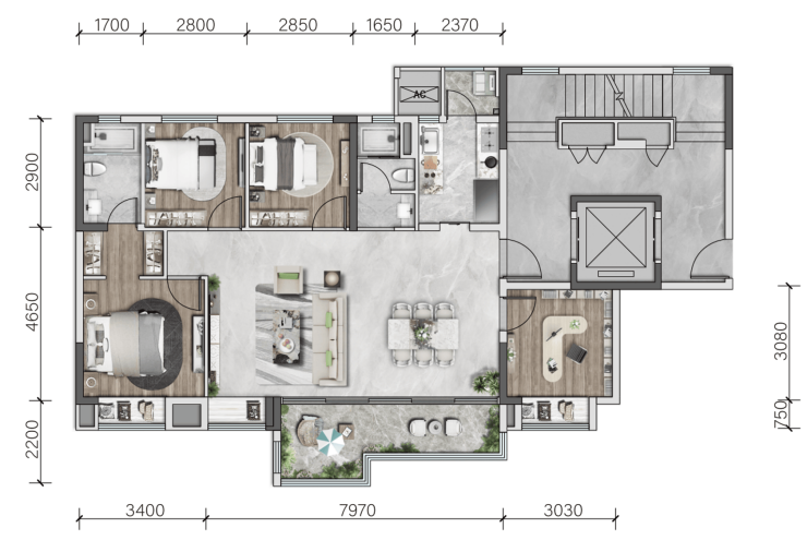 无廊柱设计,百变空间,随心改造,可满足更多面的家庭需求。