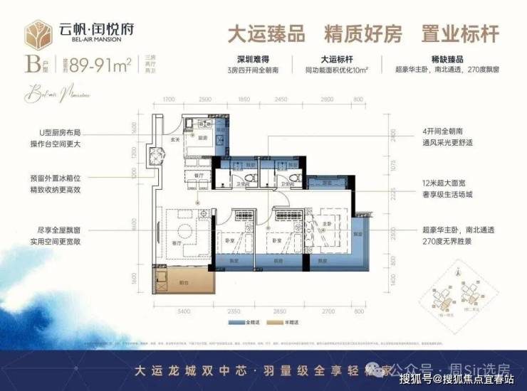 89㎡3房2厅2卫:设计的是经典横厅格局,LDKB一体化,进门入户玄关,客厅带3.5米阳台,U型厨房,主卧南北通透270度景观,卫生间干湿分离。