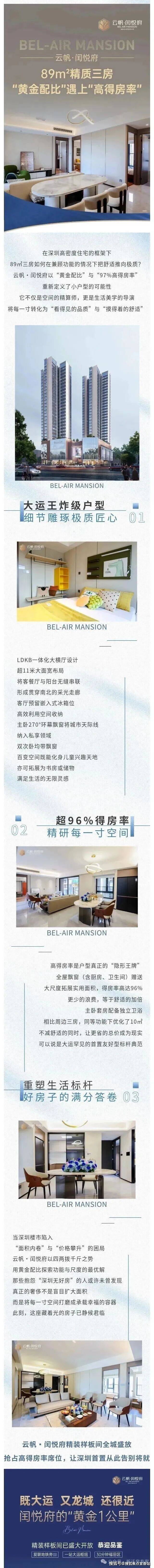 闰悦蓝湾公馆,由深圳市盛悦兴投资有限公司与深圳市爱联股份合作公司共同开发,总占地面积约7420.63㎡,总建筑面积约4.6万㎡,计容建筑面积约3.35万㎡,容积率4.3,绿化率40.01%,共由2栋27-29层高住宅组成,其中1栋1单元住宅29F,1栋2单元住宅27层。
