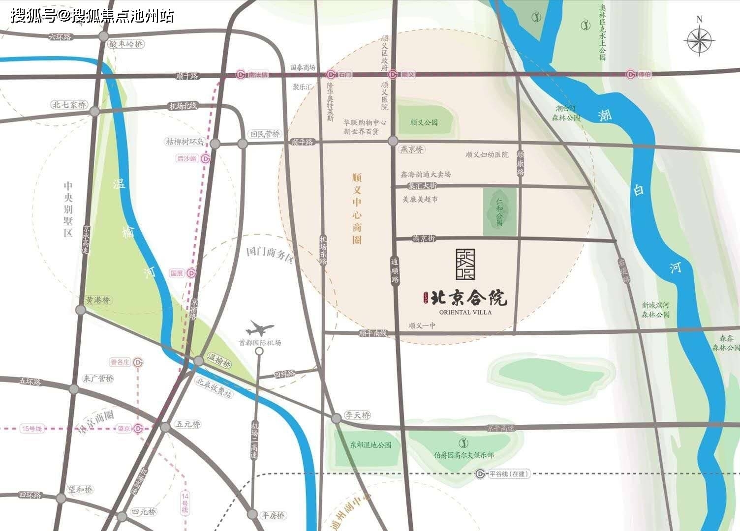 北京城建·北京合院项目坐落于北京市顺义新城核心区的第五街区,北临空港经济核心区,与首都国际机场毗邻;周边机场排名前列高速、第二高速、机场北线高速、京平高速、京承高速、六环路、机场轻轨专线L1、地铁15等形成“棋盘+放射+环线”路网格局;紧邻顺义一中、顺义一中附属小学,医疗、商业配套齐全;咫尺潮白河生态区,周边环绕仁和公园、顺义公园、新城滨河森林公园三大公园。