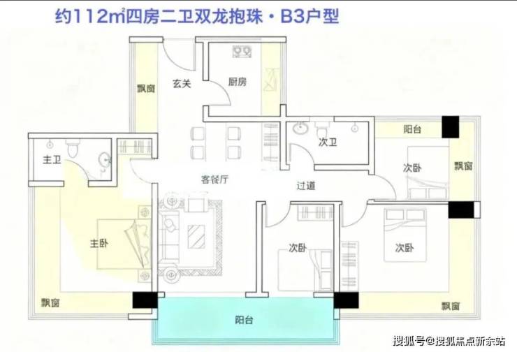 112㎡的4房2厅2卫(B3户型),设计的是竖厅双龙抱珠格局,进门独立入户玄关,餐客厅一体化设计,四开间朝南,全屋八面飘窗,主卧+1个次卧270°无柱转角飘窗,U型厨房,卫生间干湿分离,得房率约100%(包含赠送),客厅连接次卧出大阳台西南朝向。