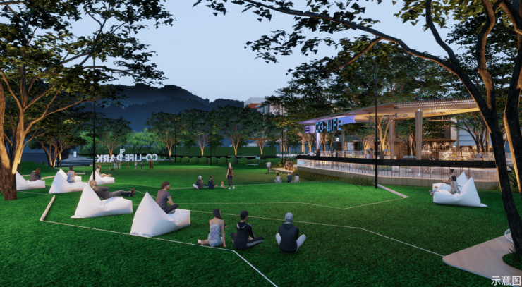 活力阳光草坪:参考日本星野OMO7酒店的设计灵感,打造约1300㎡社交草坪,形成独具特色的坐阶模块,可坐可躺,享受松弛氛围