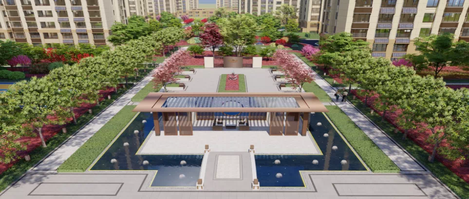 金庆·塞纳维拉采用欧式新古典园林设计,沿中轴线对称布置,以水池、树阵等构成十字对称景观轴,将东西方古典园林意境融入到园区中。