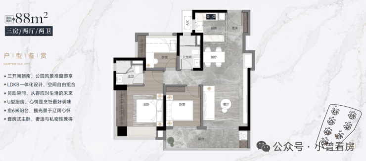 【88-90㎡三房二卫户型鉴赏】:约10㎡连体阳台,300-350万必看,相同总价比竞品多10个方
