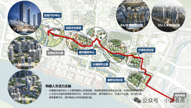 西至设施生态公园,东联南海神庙,构建串联TOD商业、文化街区、都市服务、生态社区等重点项目的漫游活力轴,重点塑造“双岗TOD中心、都市服务中心”两大综合商业地标及“双岗、沙涌”两大休闲文化街区,目前双岗TOD中心已确认引入华润万象系商业运营