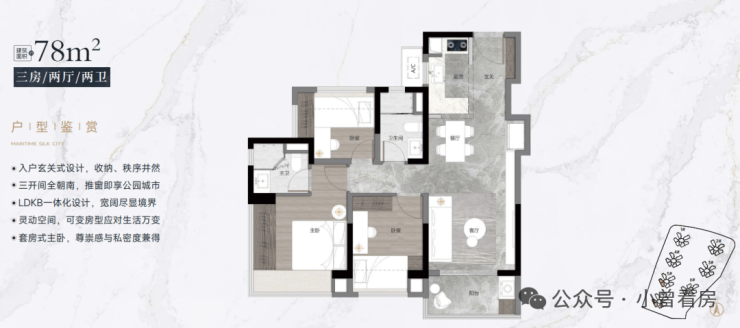 【78-79㎡三房二卫户型鉴赏】:板块最低总价南向三房二卫