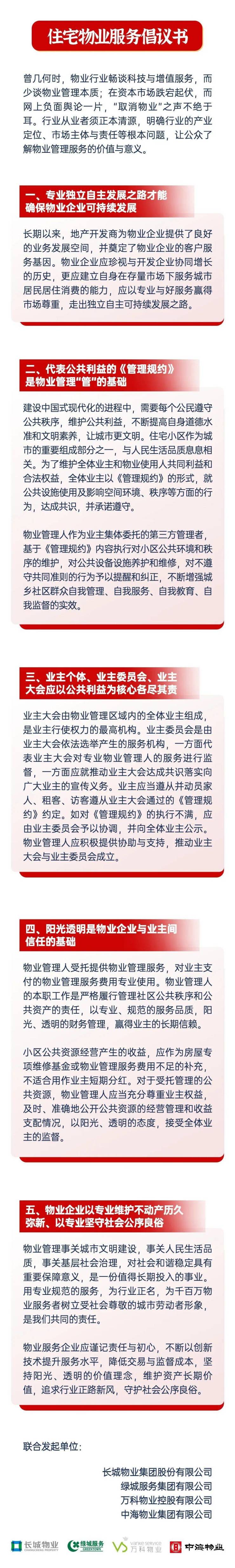 焦点财经讯 11月22日,据万物有云公众号显示,为提振行业形象,推动行业高质量发展,基于共识与责任,长城物业、绿城服务、万科物业、中海物业四大品牌物企在深圳联合签署《住宅物业服务倡议书》,面向行业与社会联合发出倡议。