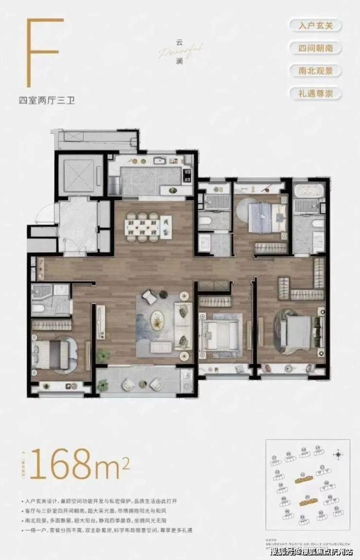 另外,四房户型双房朝北似乎是逃不开的问题,但陆家嘴锦绣云澜这个建面约168㎡的4房却做到了三间卧室全朝南,并且 南向双套房设计 。