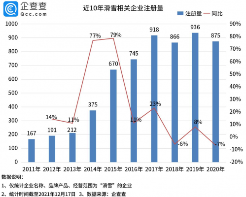 企查查数据显示,近10年滑雪相关企业注册量总体呈波动下降趋势,2015年同比增长79%,达历年来增长率峰值,注册量670家。2019年注册量达936家,同比增长8%。2020年注册量875家,同比下降7%。