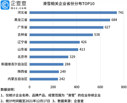 企查查数据显示,河北省是我国滑雪相关企业数量最多的省份,达741家,占比全国总量的11%,黑龙江、广东分别以684家和627家排名二三位。