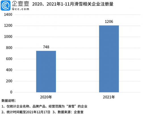 从今年注册量来看,企查查数据显示,今年1-11月共新增1206家滑雪相关企业,同比增长61%。