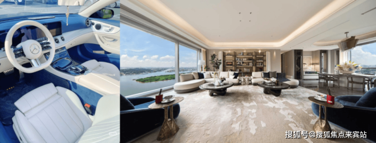 超跑除了美在外观,还美在豪华的内饰。鱼珠岛项目样板间的室内配色,是豪车常用的"游艇蓝"。室内对标超跑常用的Alcatara翻毛皮材质,大面积铺设了织物和地毯。