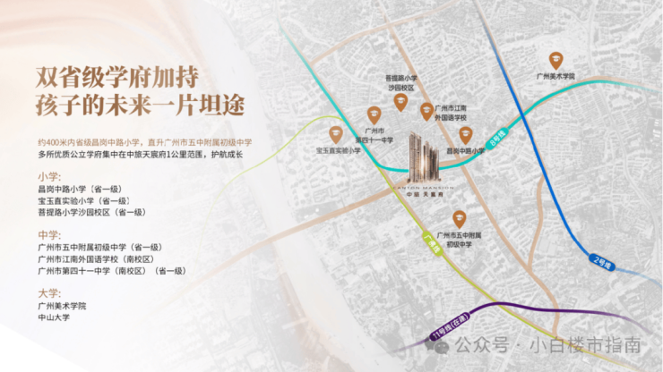 根据海珠区教育局公布《2024年海珠区公办小学招生服务地段表》:中旅天宸府所属沙园街橡胶新村社区,约500米直距昌岗中路小学,符合就近入读条件,而且按照现有政策,该小学可以直升省一级中学-广州市五中附属初级中学,从小学到初中,都在家门口500米范围内,接送也非常方便,今年五中的中考成绩最高781分,与其它几所学校并列榜眼。