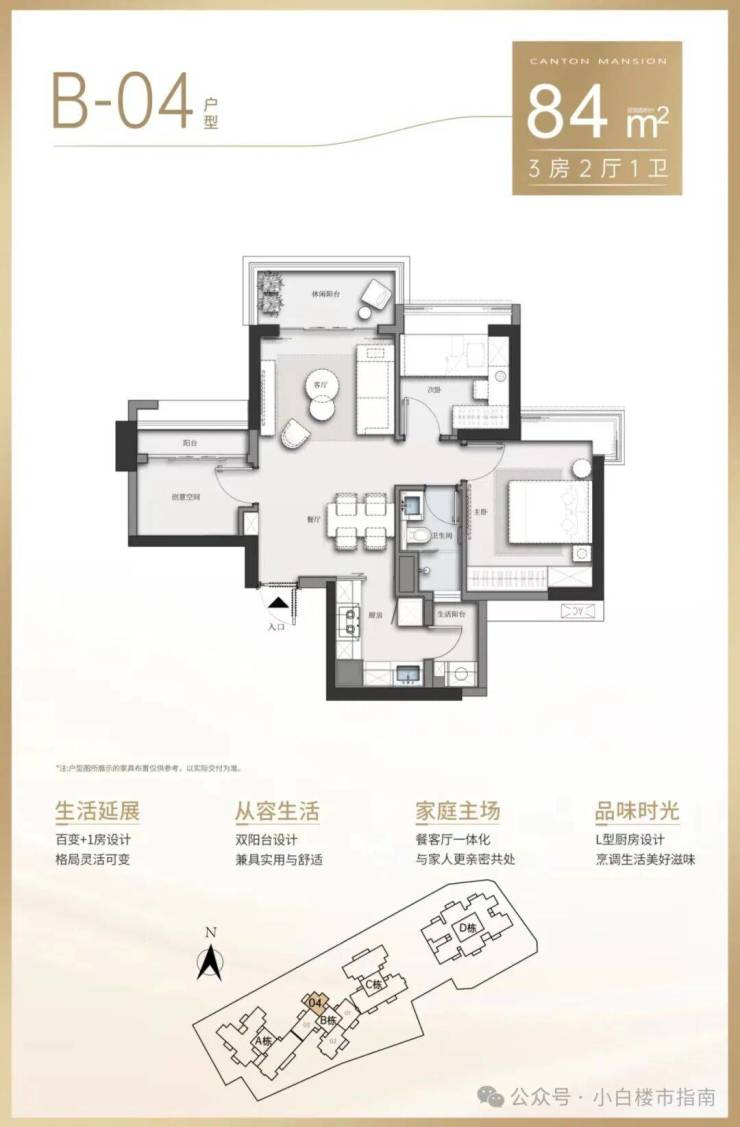 B栋04户型:约84㎡三房两厅一卫