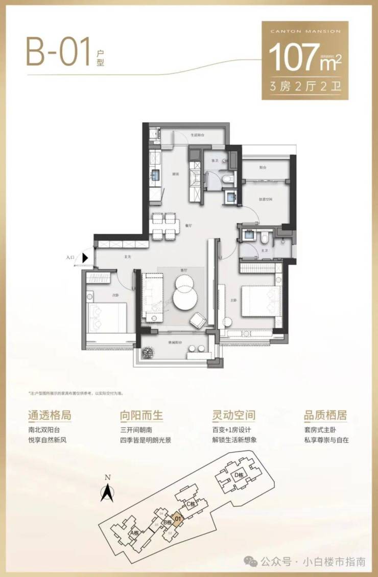 B栋01户型:约107㎡三房两厅二卫
