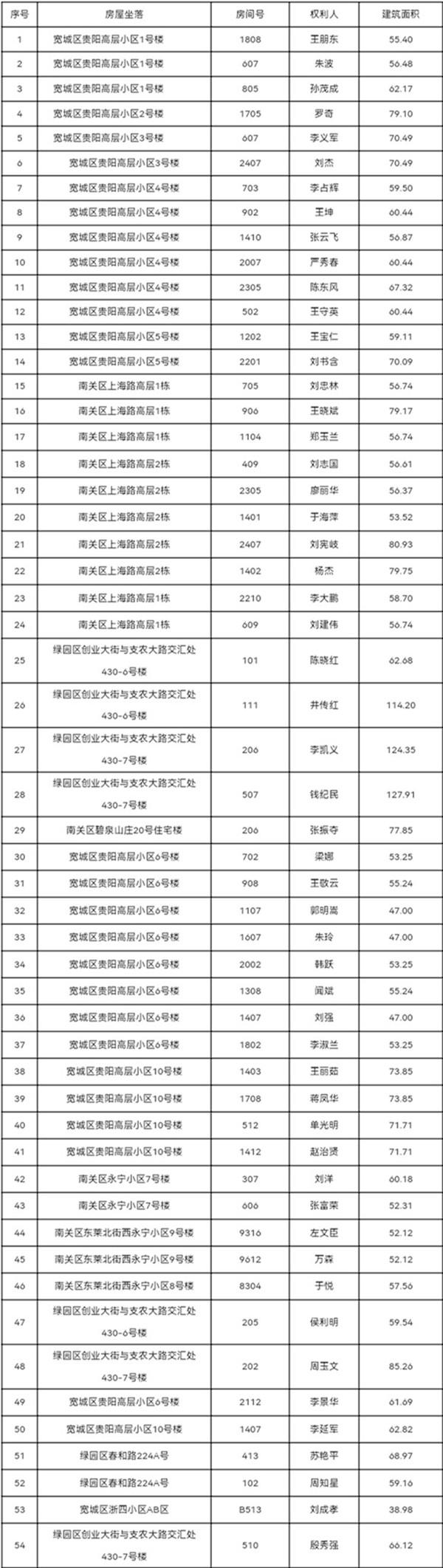 中国吉林网获悉,经长春市未登记房屋确权专项整治工作领导小组办公室及长春市房地产交易与权属登记景阳服务中心审查,以下住户初步符合确权条件,现进行公告询异,公告期一个月无异议后,直接为以下住户办理房屋所有权手续。联系电话:0431-81810703、81810592。