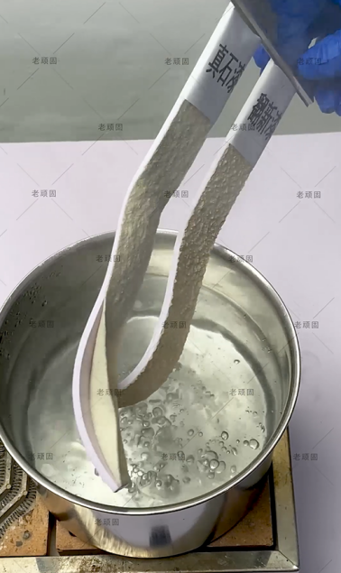 在100℃的沸水中蒸煮,模拟长期日晒雨淋的效果,这个实验中翻新漆的涂膜牢固附着在基层上,而与之相比传统的真石漆则已经被泡胀,脱离基层了;