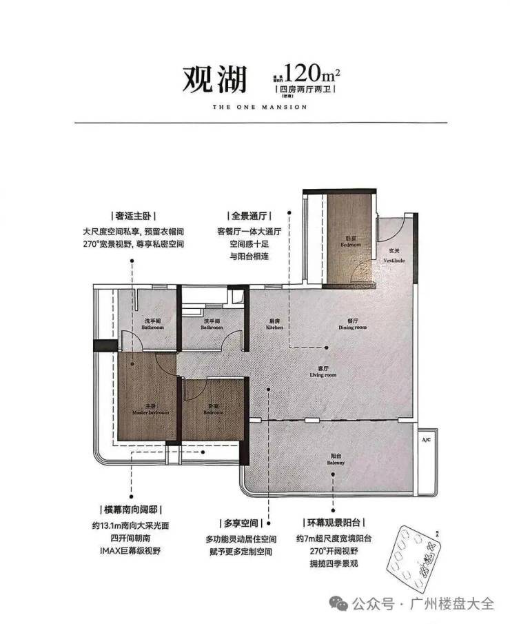 建面约120㎡户型可视为98㎡的升级放大版,保留了7米宽大阳台,南向采光面总长13.1米,进一步强化了空间尺度与功能完整性。