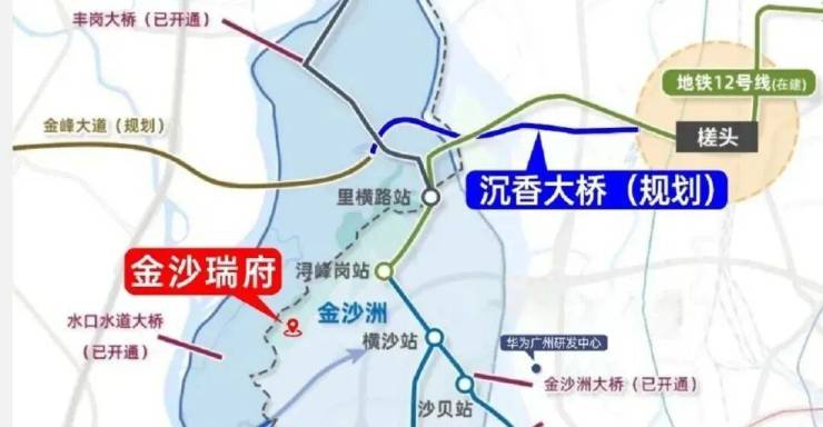 🌉 八大桥梁环抱(金沙洲/大坦沙/沉香(规划)/同心(在建)等),沉香大桥通车后金沙北至白云新城仅5公里;环城高速直连广州火车站、白云机场,极速通达全城