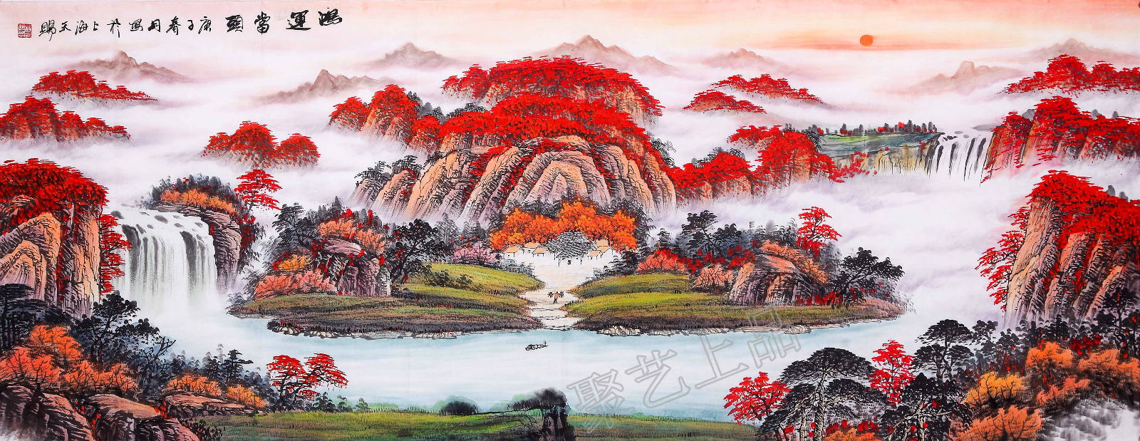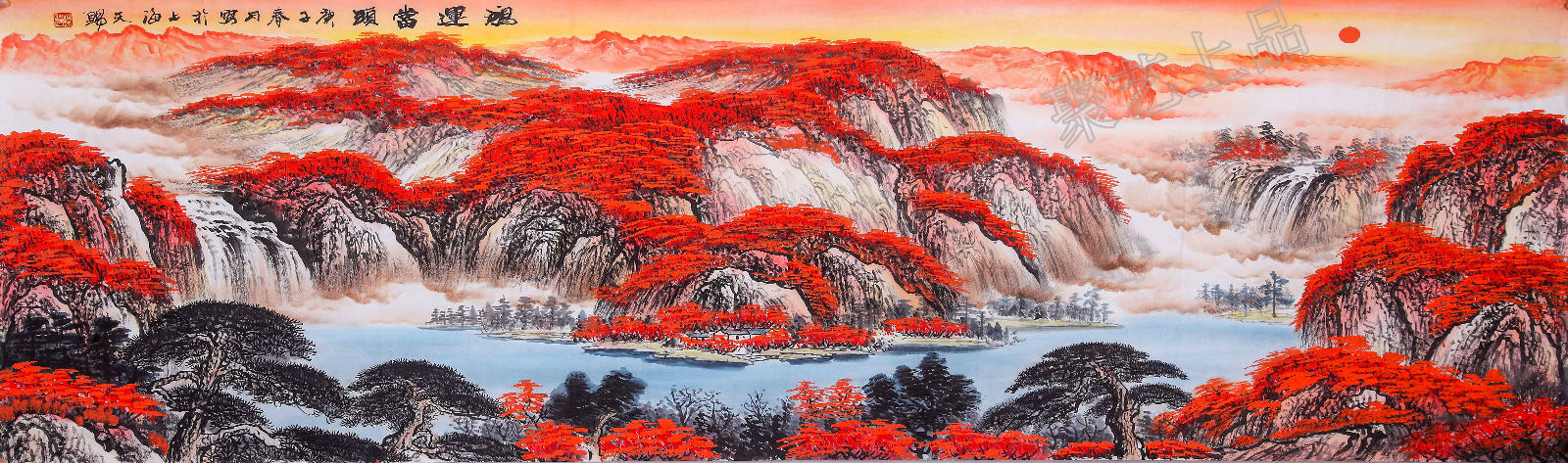 “红色”在中国有几千年的历史了,这就是为什么红色题材的山水画同样也很受欢迎的原因,鸿运当头山水画装饰在室内能使人顿增暖意,让人心情愉悦,由此,在中国字画发展的千百年来,更多的文人墨客,书画家将这种红文化运用到字画作品中,逐渐形成一种特殊的字画题材---鸿运当头山水画。