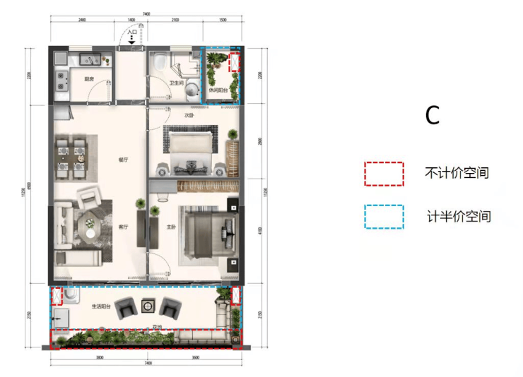 C户型 2房2厅1卫1厨 建面约90-97㎡